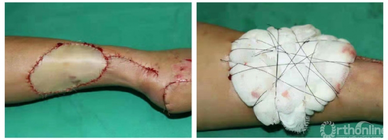 因此,作者设计了改良植皮的方法,即缝合打包跨供区加压法修复皮肤软组织缺损。