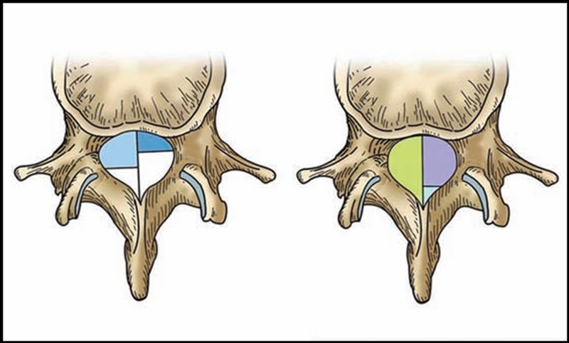 以椎体后缘为界分1~4区,两侧椎弓根内界为1、2区,中1/3为1区(中央区);左右1/3为左右侧2区(旁中央区);椎弓根内外侧之间为3区(外侧区);椎弓根外侧以外为4区(极外侧区)。(图2)