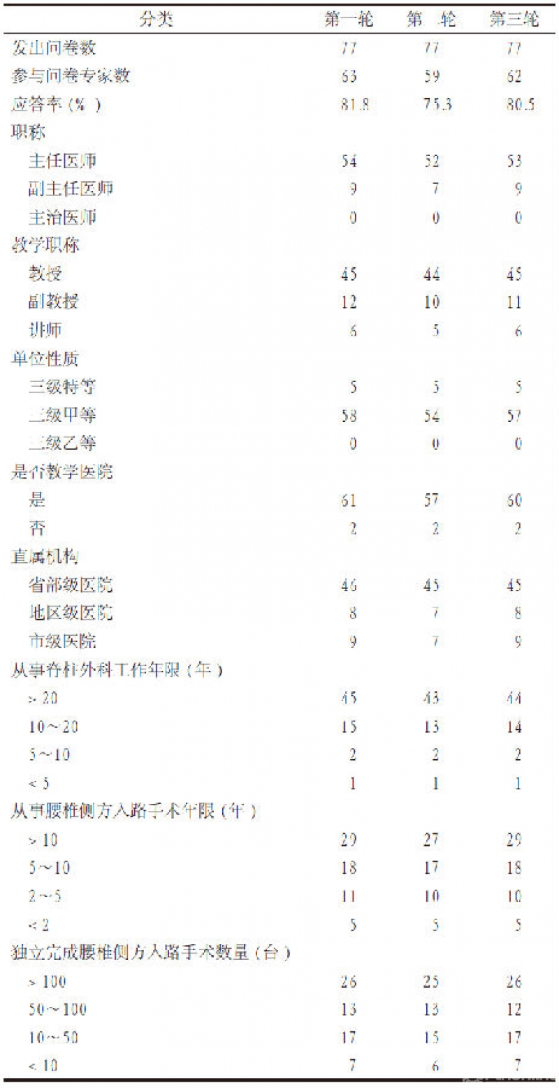 选择专家是Delphi调查研究法制定专家共识成败的关键,专家选择不当就会增加调查中的偏倚及导致咨询过程中应答率的下降。本研究专家代表来自目前中国惟一的腰椎侧方入路研究组织——中国康复医学会脊柱脊髓专业委员会腰椎研究学组侧方入路手术研究组,专家团队来自全国十几个省、自治区、直辖市的医疗系统。