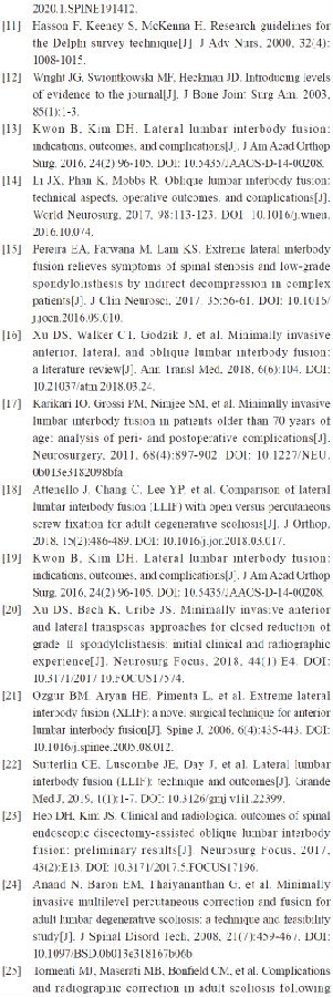 笔者的研究也存在一些不足:(1)选取专家均来自国内,并未在国际范围内选取专家代表,因此制定的专家共识不适用于其它国家和地区;(2)应用解剖学对于手术入路、手术技术、并发症防治等方面具有重要影响,本轮调查问卷因涉及专家均为领域内的有丰富临床经验的医生,因此没有涉及应用解剖学相关内容,对于技术的初学者,还需查阅相关书籍,完善应用解剖学相关知识;(3)没有详细区分XLIF、OLIF、LLIF、CLIF及DLIF等,尽管这些技术都是侧方椎间融合技术的典型代表,却存在一定的差异[49-50];(4)选取专家中无中医骨科专家,专家组对保守治疗中所涉及的针灸、推拿、按摩等中医骨科治疗方法的疗效缺乏充分认识。
