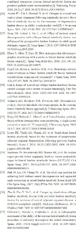 Hijji等[39]对LLIF进行系统回顾,研究共纳入63篇文章包括6819例患者。结果发现LLIF术后常见的并发症是短暂的神经损伤,其发生率为36.1%,但永久性损伤只有4.0%。