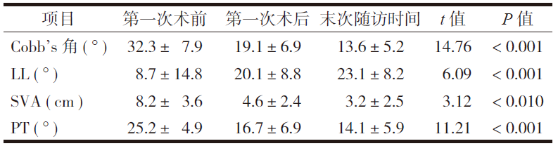 所有患者在两次手术前后均使用EOS影像系统摄站立位脊柱全长X线片,应用EOS软件系统测量患者的矢状面平衡参数包括PI、骨盆倾斜角(pelvic tilt,PT)、LL、SVA以及冠状面Cobb’s角,比较手术前后冠状面和矢状面平衡参数的变化。
