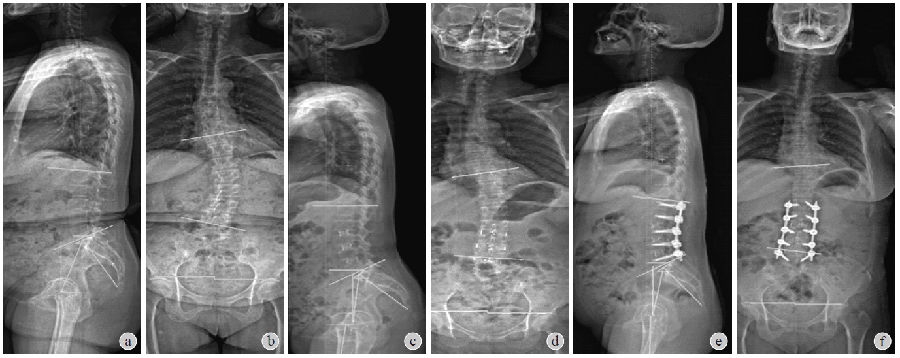 图1 患者女,65岁,退变性脊柱侧凸a、b:X线片示严重矢状面和冠状面失平衡,术前评估固定范围T10~L5;c、d:L2~5侧方植入OLIFcage后,X线片示无论是冠状面还是矢状面的平衡都得到明显改善,再次评估固定范围为L1~5;e、f:植入经皮椎弓根固定术后3年,X线片示冠状面和矢状面平衡维持良好