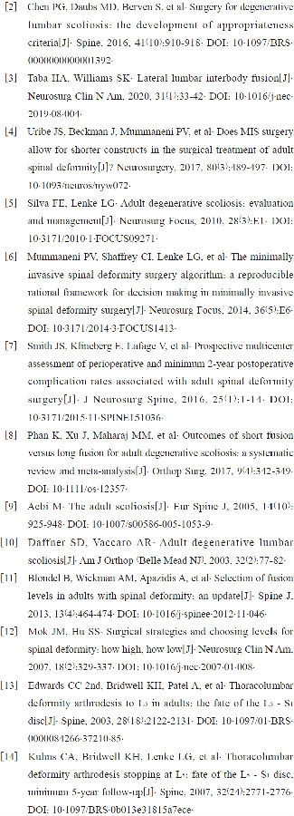对于退变性脊柱侧凸手术固定融合范围尚未有一个完全统一的标准,理论上说LLIF/OLIF术后脊柱的冠状面和矢状面平衡发生了改变,那么所需要固定的范围也应该有所调整。Uribe等[4]通过匹配队列研究比较分析微创手术和开放手术,研究发现微创组固定融合节段较短,椎间融合节段较多,但微创组和开放组术后功能评分和再手术率相似,从而得出结论,微创手术可能缩短固定融合的范围。但是目前没有研究直接评估微创手术尤其是腰椎侧路椎体间融合术是否可以减少退变性脊柱侧凸的固定节段。
