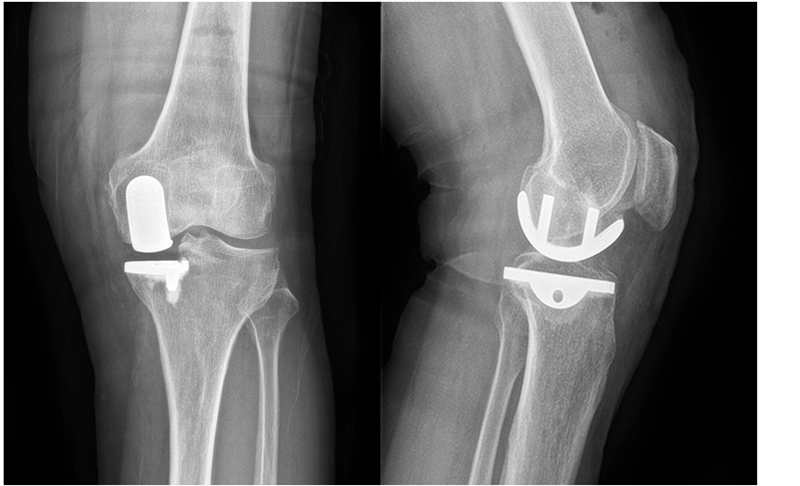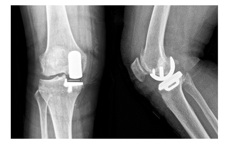 图4术后 X线片示假体位置良好,大小合适,活动垫片在位
