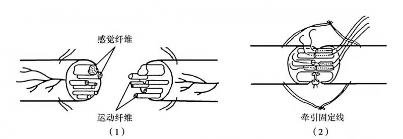 图4 神经束膜缝合术(1)分辨运动和感觉神经纤维;(2)神经束膜缝合