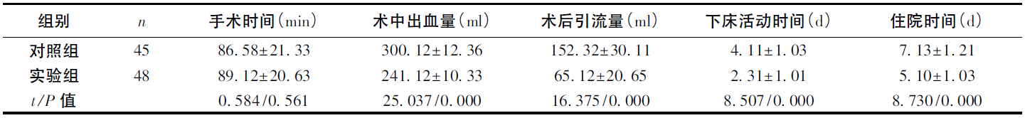 两组手术时间差异不显著(P>0.05);实验组术中出血量、术后引流量、下床活动时间、住院时间均明显低于对照组(均P<0.001)。见表1。
