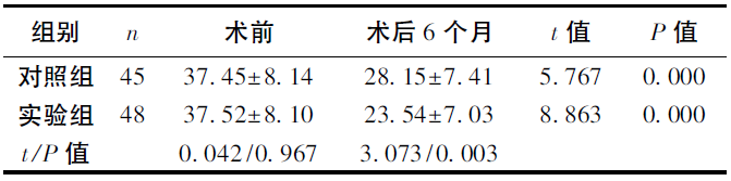 术前,两组疼痛程度差异不显著(P>0.05);术后6个月,两组VAS评分均有所下降,且实验组明显低于对照组(均P<0.001)。见表3。