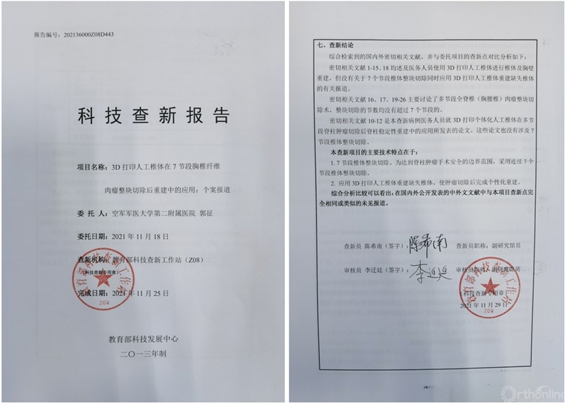 2021年底空军军医大学唐都医院收治了一位特殊的病人,恶性纤维肉瘤侵蚀了患者的七节椎体,在背部形成破溃,并且造成了截瘫,整块切除的难度和危险性很大,切除后的重建也极具挑战性。术前团队与全院多个科室反复推敲模拟手术过程,制定手术方案。为了重建脊柱缺损,团队决定采用3D打印技术为患者量身定制钛合金人工椎体,确保脊柱稳定性。术中骨科、整形外科、胸外科,烧伤科、麻醉科等专家通力协作,手术全程18个小时,术后患者恢复良好。经过科技查新,这是世界首例脊柱七椎体肿瘤整块切除重建案例。回顾全程,团队完成了一场考验经验丰富度、协作默契度、工作认真度的实践大考,也着实打赢了一场酣畅淋漓的硬仗。