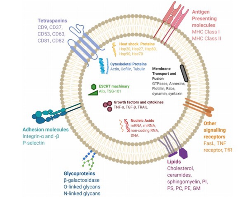 外泌体的成分示意图(doi:10.1186/s12964-021-00730-1)