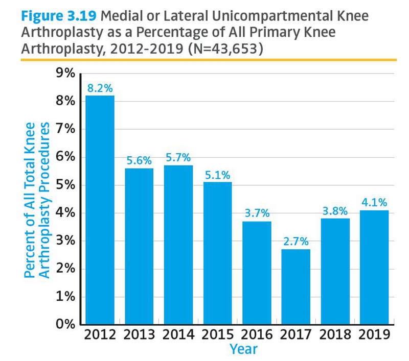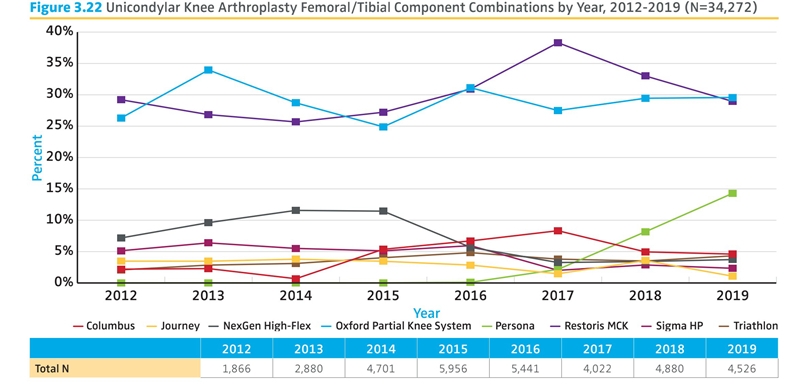 近些年随着膝骨关节炎阶梯化治疗理念在国内的不断深入,作为膝骨关节炎终末期的治疗手段之一,单髁置换因为其更小的创伤、更快地恢复以及更高的患者满意度等特点被越来越多的医生和患者所接受。单髁的手术量也呈现了一个井喷式的增长,以牛津单髁为例,在国内以每年40-50%的平均复合增长率连续数年快速增长,中国已经成为全球第二大单髁消费市场,而且有望在短期内超过美国成为全球第一大单髁市场,加上去年的关节国家集采单髁产品并没有被纳入目录,因此有观点认为国内单髁市场的春天来了。而2019年的一份关于美国的关节登记系统(AJRR)的报告却显示:美国的单髁份额呈现了一个逐年下滑的状态,因此国内出现了另外一种声音,认为国内目前的单髁增长并非理性,和主流步调并不一致,更可能是一哄而起的运动,从而是昙花一现。这些不同观点的碰撞使得一些准备加入保膝治疗领域的医生产生了很大的困惑,到底哪一种观点更正确?目前国内和国际上单髁的使用情况到底如何?单髁未来的前景如何?带着这些问题,笔者通过梳理目前各国关节登记系统数据以及国内厂家的一些公开信息,希望能够找到目前现状的一些底层逻辑,并能够试图解释目前的一些现状,以及大胆地对国内未来单髁的发展趋势进行预测。