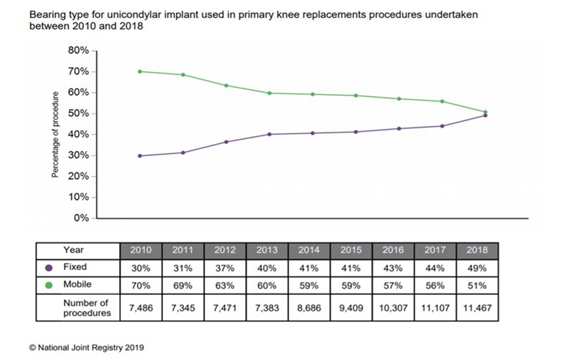 1.7 澳大利亚关节登记系统(AOANJRR):建于1999年,全国范围的收录关节置换病例。数据披露始于2002年,截至2019年系统中已经登记了160多万关节置换病例。单髁的病例数据始于2003年,当时占初次膝关节置换的比例为14.5%,此后逐年减少,到了2014年跌到谷底,占4.2%,随着机器人引入单髁置换,单髁近些年比例又有所增加,到2019年占比为5.6%。在假体类型中,固定平台单髁具有绝对优势,2019年占73%,活动平台单髁占27%,其中生物型活动平台占83%。