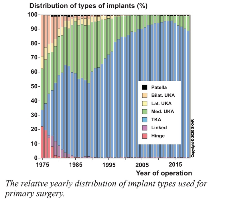 1.5 瑞典膝关节登记系统(SKAR):始建于1975年,是全球最早的膝关节登记系统,属于非强制性自愿加入的登记系统,但涵盖了绝大多数在瑞典做的膝关节置换病例,于2020年开始与髋关节登记系统合并。上世纪70年代时,全膝置换刚开始引入瑞典,所以最开始全膝置换占比并不高,内、外侧单髁以及双侧单髁占比近70%。而内、外侧单髁占比约为35%,到上世纪90年代时,单髁占比达到了顶峰,约占初次置换的50%,此后一路下滑,直到2014年跌到谷底,约占4%左右,此后又逐渐增加,2019年单髁占比约11%(图5)。在假体的使用类型上,牛津单髁假体占比最高,约69%。
