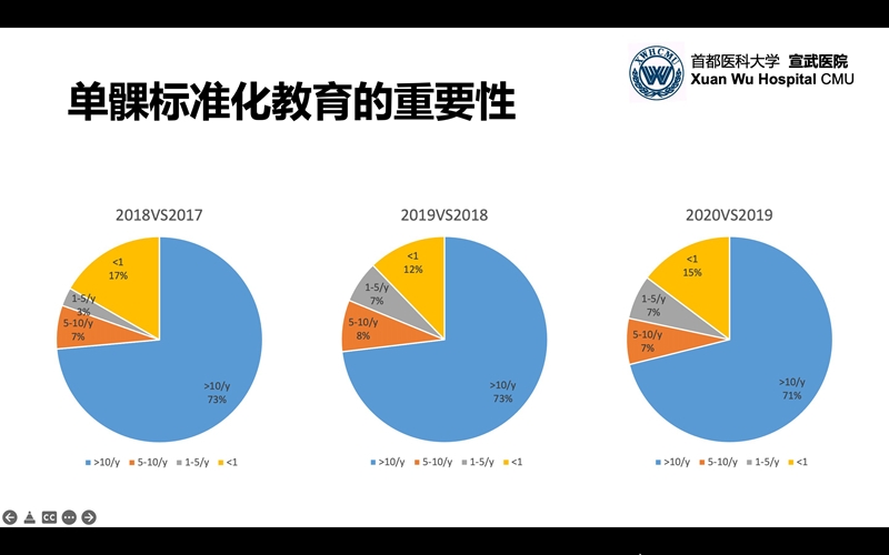 那么单髁的这种增长是否合理?国内目前的单髁增长势头是否会成为昙花一现?要回答这个问题,我们需要看一下来自于国内牛津单髁2017-2020年度的数据对比分析,从图7中我们可以看出,这四年间每年的同比增长中>80%的增长来自于已经开展过单髁手术的医院和医生,说明这种增长是来自于已经有经验的医生团队,并且是对于单髁更有信心,而不是来自于完全无经验的新手,这种增长并非一哄而上的非理性增长,是相对稳固和扎实的,而在这里单髁的标准化教育功不可没。