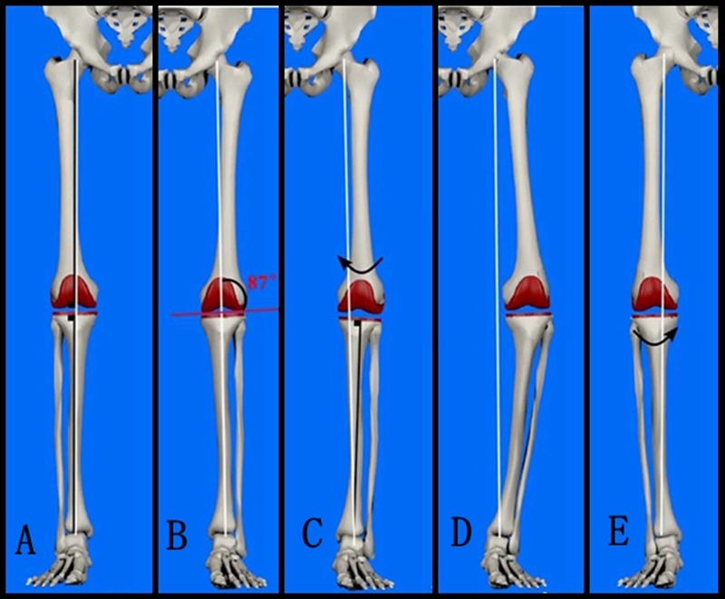 aMA技术,即对严重冠状面畸形时,术中容许残留轻-中度畸形。利用股骨侧截骨调整下肢力线,而胫骨截骨面仍垂直胫骨机械轴。(建议必要时采用)。