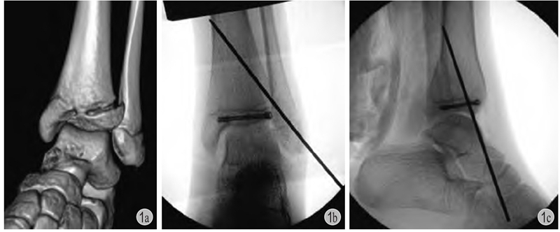 a:左胫骨远端三平面骨折;b、c:切开复位,空心钉+克氏针固定,空心钉平行骺板且位于骨骺内,辅以斜行克氏针穿越骺板固定