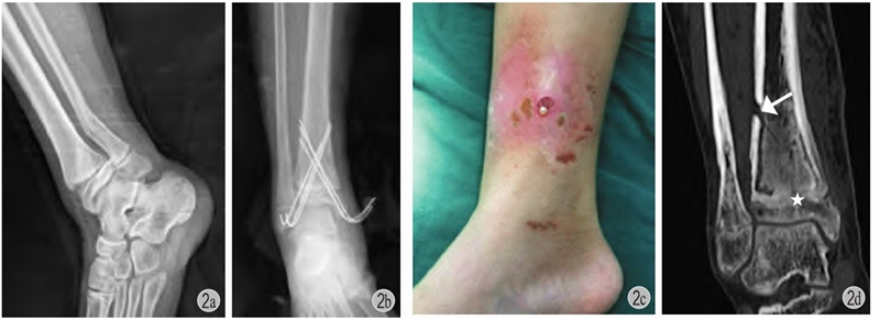 a:右胫骨远端骨骺骨折(Salter-HarrisⅡ型)合并腓骨远端骨折;b:闭合复位,胫骨远端6枚克氏针贯通骺板固定;c:术后4个月见右小腿远端红肿,流脓;d:愈合后出现胫骨远端骺板早闭(星号)+局部皮质骨坏死(箭头)+慢性骨髓炎形成