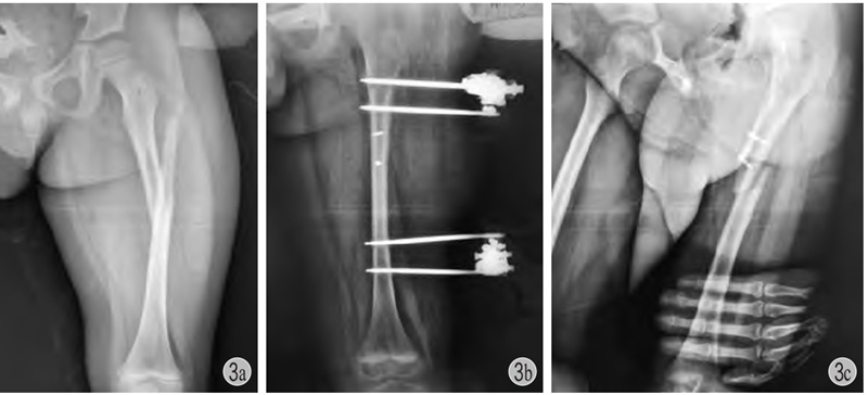 a、b:左股骨干骨折,应尽量闭合复位应用弹性针或肌肉下接骨板固定,该患儿切开复位,局部螺钉+外架固定;c:拆除外架后3个月发生再骨折