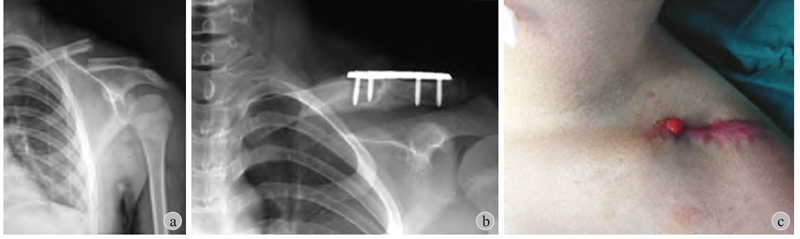 a:左锁骨骨折应考虑保守治疗;b:外院行切开复位+接骨板固定;c:术后发生感染及骨髓炎