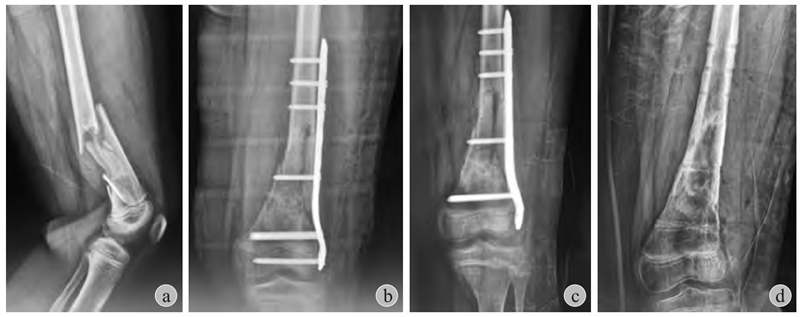 a:左股骨远端粉碎骨折;b:切开复位+跨骺板Liss钢板固定;c、d:术后2个月虽然取出骨骺内螺钉,7个月后仍然出现膝外翻畸形