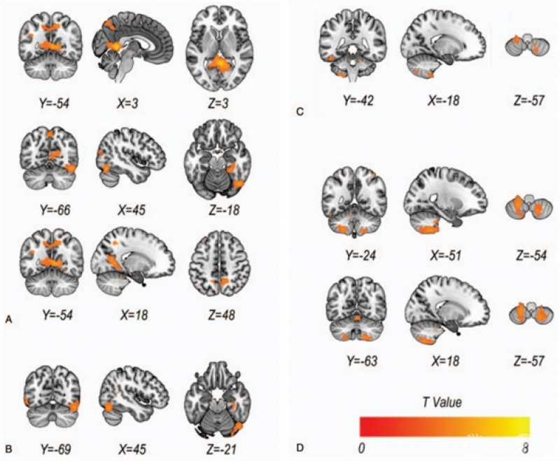 图1 相对于对照组,CSM患者视觉相关脑区之间(A.B.C)以及与小脑(D)的功能性连接增强,这可能是对视觉受损的一种代偿