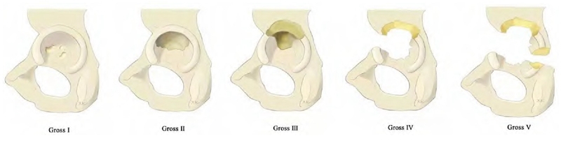 科学、合理的分型能够指导术前评估与手术计划。目前常用的髋臼骨缺损分型包括美国骨科医师协会(American Academy of Orthopaedic Surgeons, AAOS)分型、Paprosky分型、Gross分型和Saleh分型。