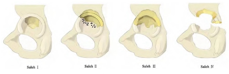 Saleh等认为,以往的各种髋臼骨缺损分型存在过于复杂或过于简略、缺乏普适性等问题,应当提出一种具有科学性、便于运用且区分度好的新分型。他们基于多属性效用理论(multiattribute utility)和共识小组评议法(consensus group technique)提出了Saleh分型(图 4)。该分型将髋臼骨缺损分为4个类型:Ⅰ型无明显骨缺损;Ⅱ型存在包容性骨缺损,即髋臼腔度变大,但没有髋臼壁缺损;Ⅲ型存在非包容性骨缺损,前柱或后柱受累及,但缺损小于髋臼的 50%;Ⅳ型存在非包容性骨缺损,前后柱均受累及,缺损大于髋臼的 50%。此分型的观察者间信度Kappa值为0.89,平均有效性验证值为0.86,均在流行病学专家确定的强可靠性范围内(0.8~1.0),因此在临床上越来越受到青睐。