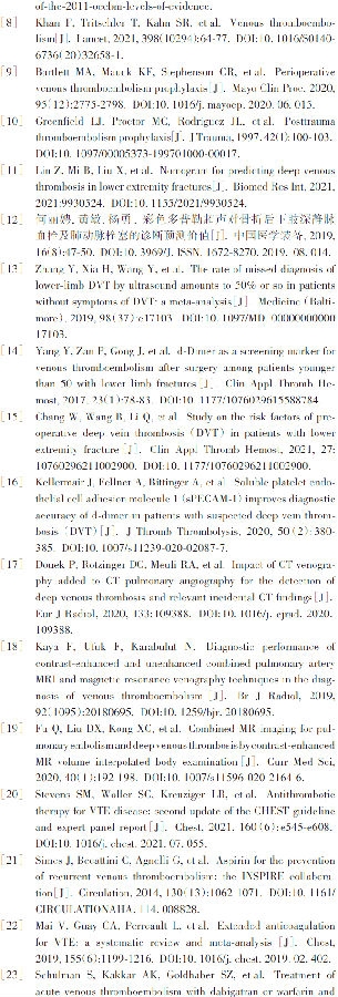 术前血浆D-二聚体水平对下肢骨折后静脉血栓形成的预测具有一定的指导意义,有利于DVT的早期预测和诊断[15]。D-二聚体是监测血栓的敏感指标,但特异度仅为40%~50%,原因是有较多的因素可影响其变化,如近期手术、受伤史、妊娠、高龄、肿瘤等。