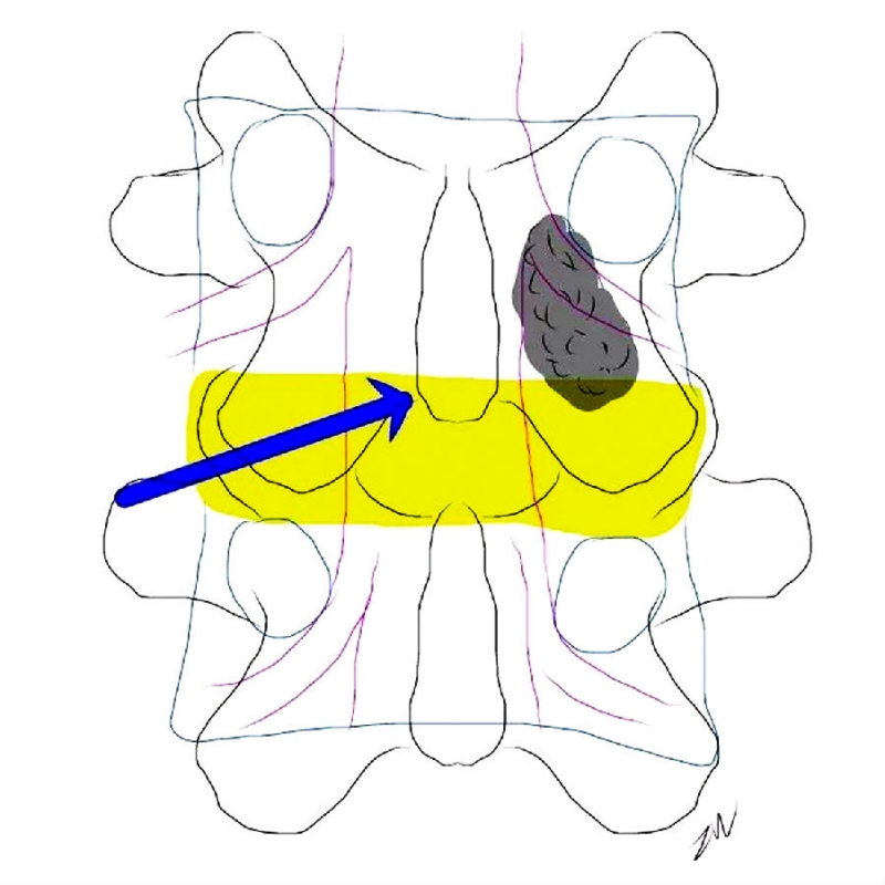 临床中经常会遇到椎间盘脱出髓核游离的病例,髓核组织向上方游离或者向下方脱垂。选择症状同侧入路的话,必然会做很多bonework,很容易造成术后腰痛及医源性不稳。对于上腰椎来说做大范围的椎板切除可能导致峡部断裂。