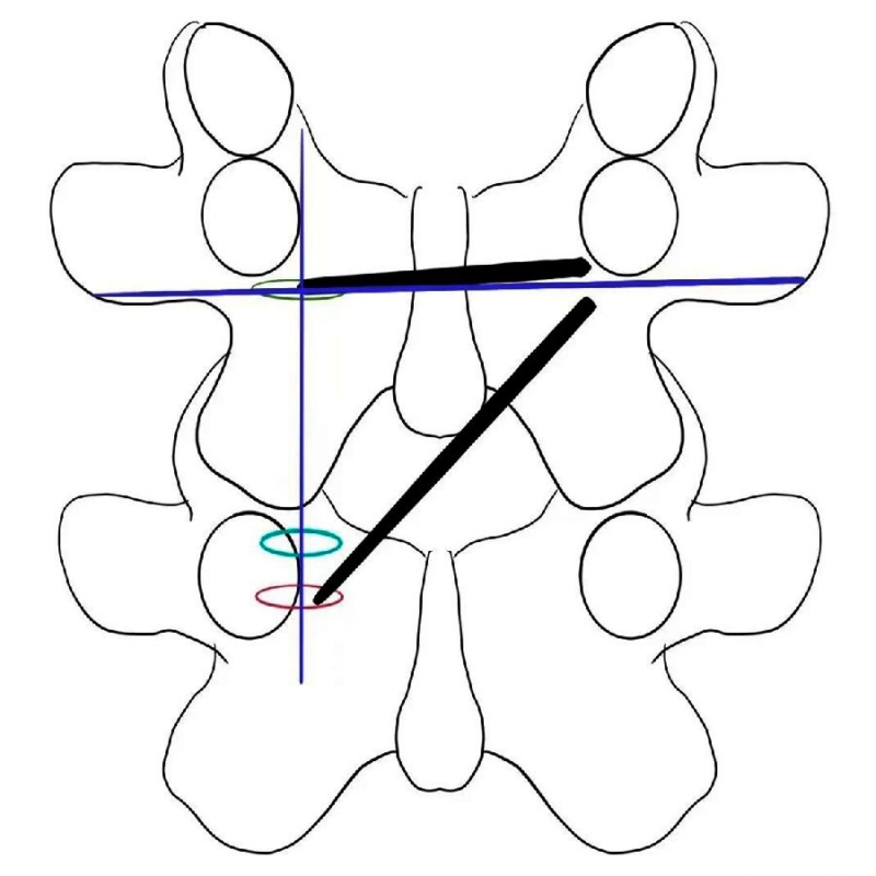 translamina入路操作口的位置非常重要,最好位于对侧下位椎体椎弓根下缘水平,内镜口也随之向远端移位。