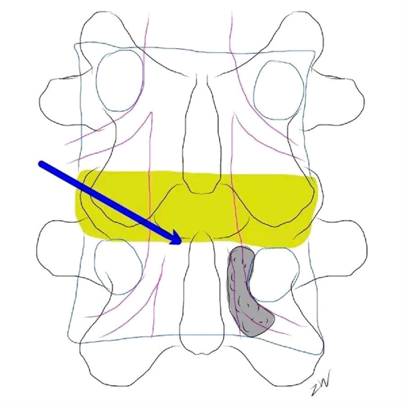 对于UBE技术而言,人们设计了对侧入路(contralateral approach)。对侧入路包括:sublaminar approach及translaminar apporach,临床可根据髓核脱出的方向选择相应的入路。