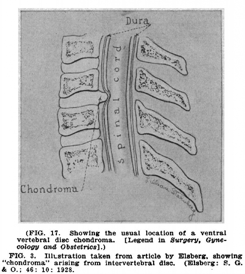 原文中引用的Elsberg(1928)发表的文章中的观点代表当时的主流观点,认为此类椎间盘突出是来源于椎间盘的软骨瘤。