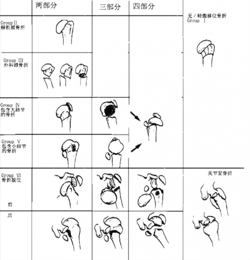A型:关节外单处骨折;B型:关节外两处骨折;C型:关节内骨折,该分型提示了肱骨头坏死的危险性。