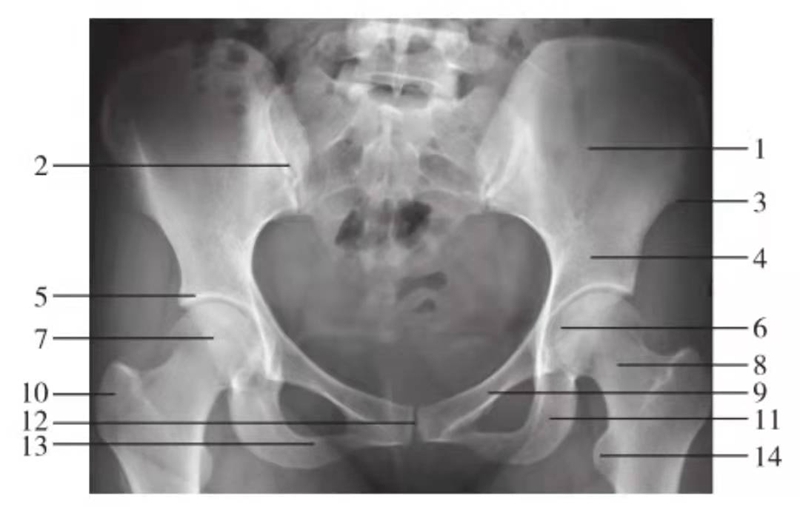 1.髂骨翼;2.骶髂关节;3.髂前下棘;4.髂骨体;5.髋臼顶;6.股骨头凹;7.股骨头;8.股骨颈;9.耻骨上支;10.大转子;11.坐骨支;12.耻骨联合;13.耻骨下支;14.小转子