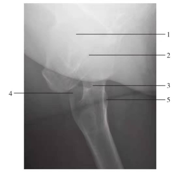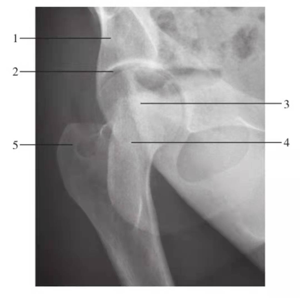 1.髂骨;2.关节间隙;3.股骨头;4.股骨颈;5.大转子