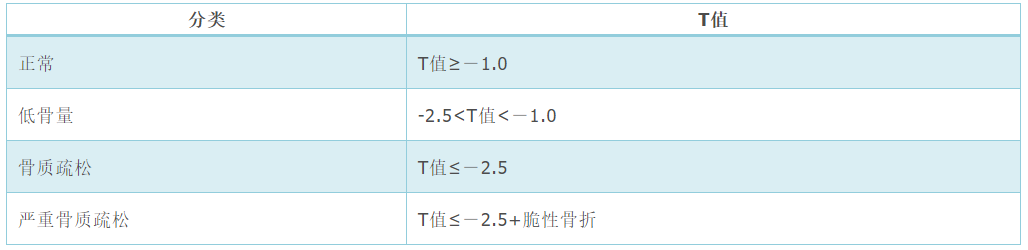 骨密度通常用T值表示,T值= (实测值-同种族同性别正常青年人峰值骨密度)/同种族同性别正常青年人峰值骨密度的标准差。