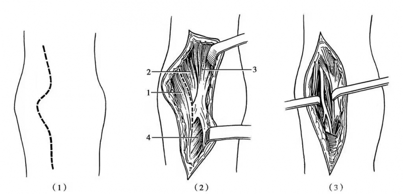 图9 前臂背外侧切口显露桡神经深支(1)切口;(2)分开指总伸肌 1.与桡侧腕短伸肌;2.的肌间隙便能显露桡神经深支,从旋后肌;3.穿出后的一段神经