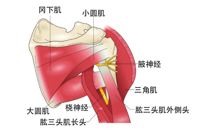 腋神经与桡神经同起自后束,并行到肩胛下肌缘时,腋神经与旋肱后动脉一同穿出腋窝,而桡神经仍在腋窝下行至背阔肌和大圆肌前方,到大圆肌下缘后,桡神经与肱深动脉伴行。经过肱三头肌长头的外侧面,继续在肱三头肌长头和内侧头之间向外下方,穿出腋窝到达上臂的后面。