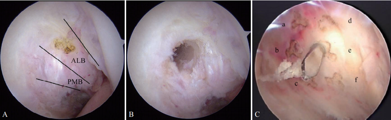 A.股骨前外束定位点,远前外侧入路下直视定位,选择前外束(髁间窝11点位置)作为股骨隧道内口定位点;B. 股骨定位点,远前外侧入路下直视定位,选择前外束与后内束交界部位(髁间窝10点30分位置)作为股骨隧道内口定位点;C. 股骨等长定位点,PCL在股骨内侧髁上的止点范围扇形划分为a、 b、 c、 d、 e、 f 6个点,其中e点(髁间窝10点30分位置)与PCL胫骨止点之间最接近等长