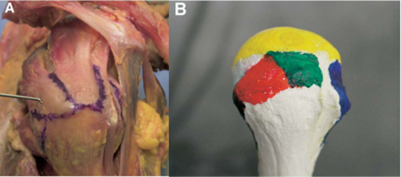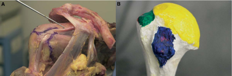 图1 (A)解剖前标记间隔的完整肌腱单位的侧位图;(B)显示冈上肌(绿色)和冈下肌(红色)足迹的模型;肩胛下足印(蓝色)位于二头肌沟前面。