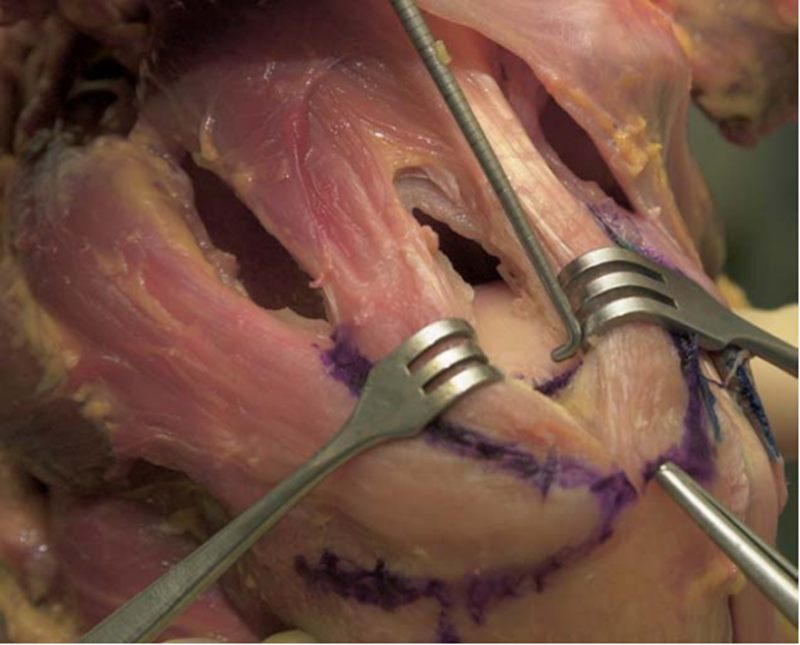 TM是最小的肌腱,附着的面积相对较大,从3点到5点呈三角形附着(图4)。平均最大长度为29mm(范围为20-40mm),平均宽度为21mm(范围为10-33mm)。附着点上部为少量腱性纤维,很快过度到下半部的单纯肌肉止点。距关节面的距离为7~20mm,平均10 mm。
