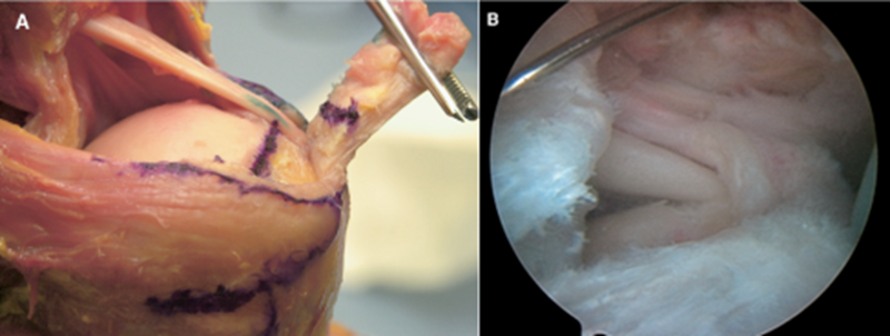 图3 (A)冈上肌的足印区;(B)关节镜下照片,显示冈上肌腱完全撕裂,前沿肩袖前肌间隙,后沿冈下肌/冈上肌间隙,暴露足印。这是一种“舌型”撕裂。
