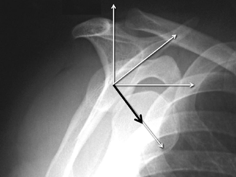 b)患侧的肩胛盂骨质缺损。D来自完整侧,完整的肾盂宽度D与缺损的肾盂宽度之间的差值为缺损宽度d。缺陷的大小表示为d/D×100(%)。