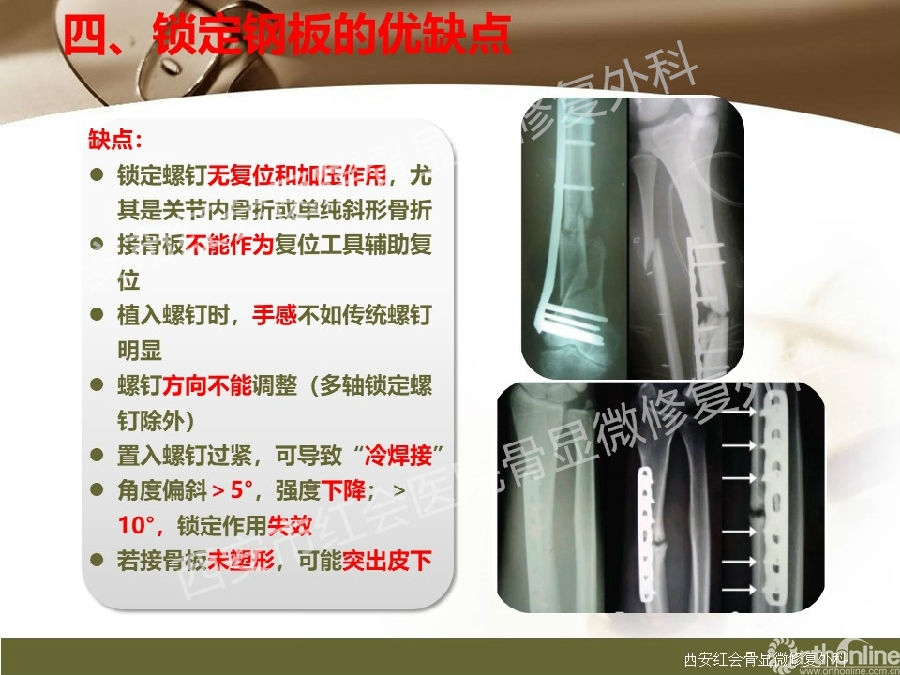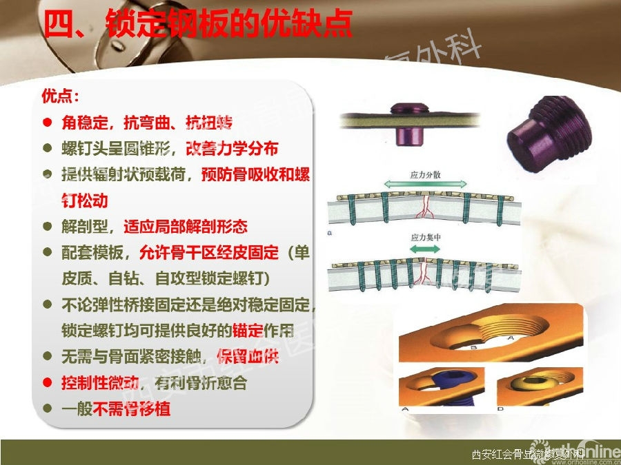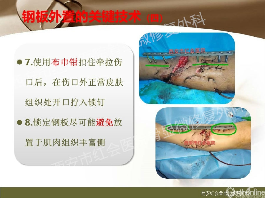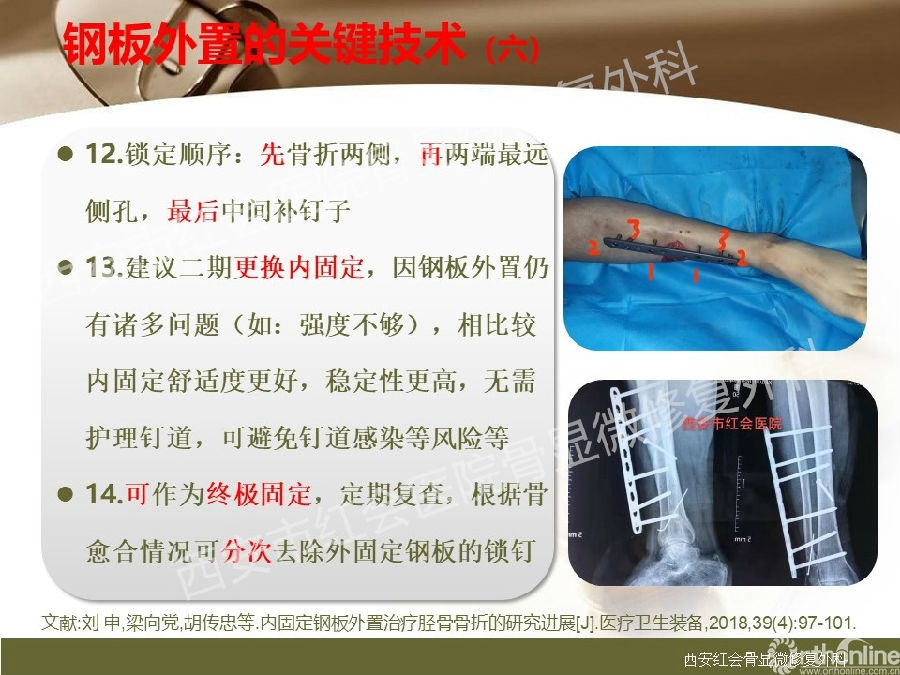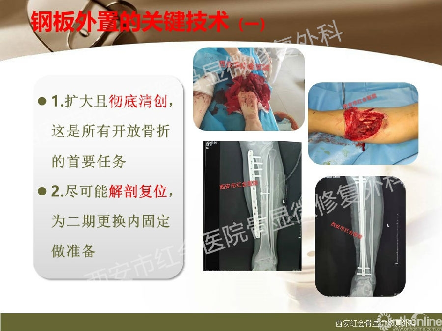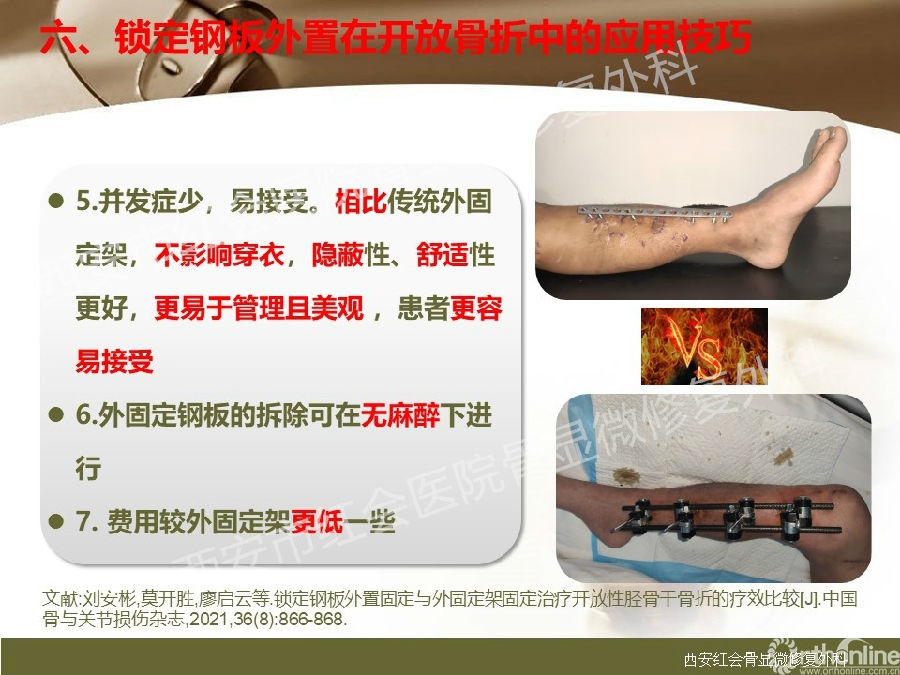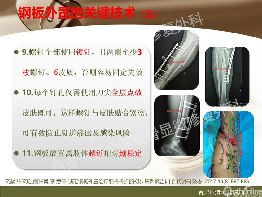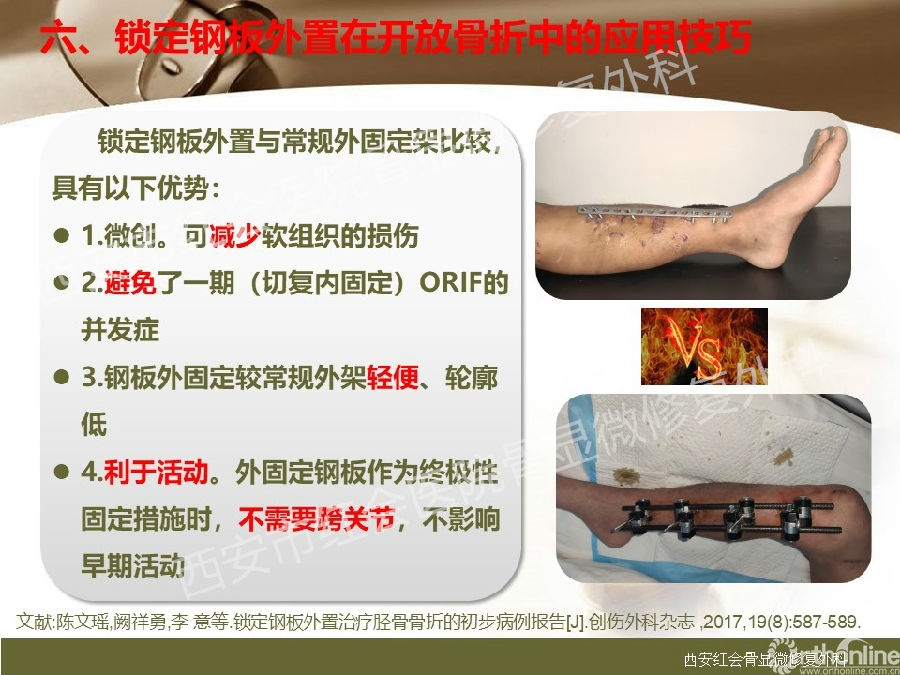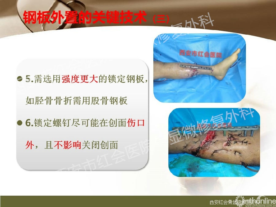编者按:带螺纹孔的接骨板,与螺纹头的螺钉结合,共同构成角稳定的固定装置。不带螺纹孔的接骨板,通过钢板螺钉结构不同或垫圈进行挤压嵌入构成角稳定装置,称为锁定钢板。锁定接骨板技术是骨折治疗发展史上的重要里程碑之一。西安市红会医院骨显微修复外科张世辉医生从锁定钢板的作用、应用原则、适应证、禁忌证和优缺点等出发,分享了锁定钢板外置在下肢开放骨折中的应用,供广大同道参考学习。