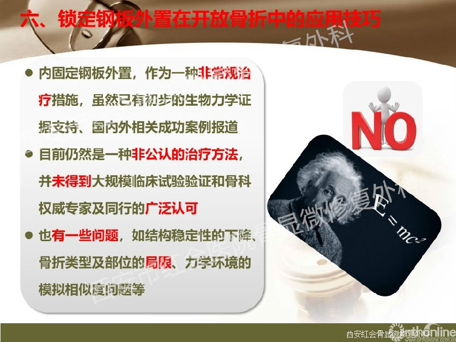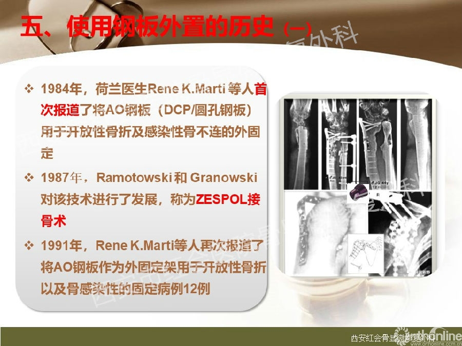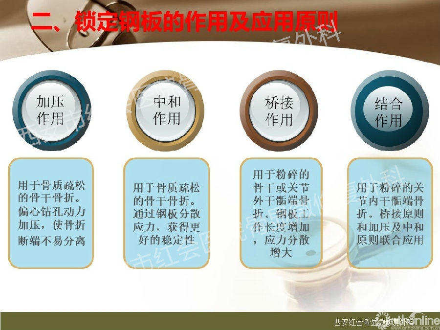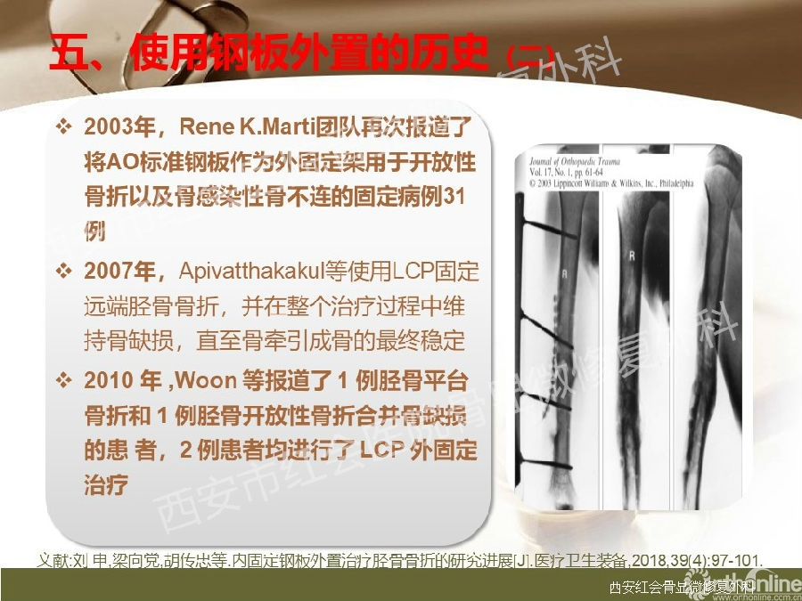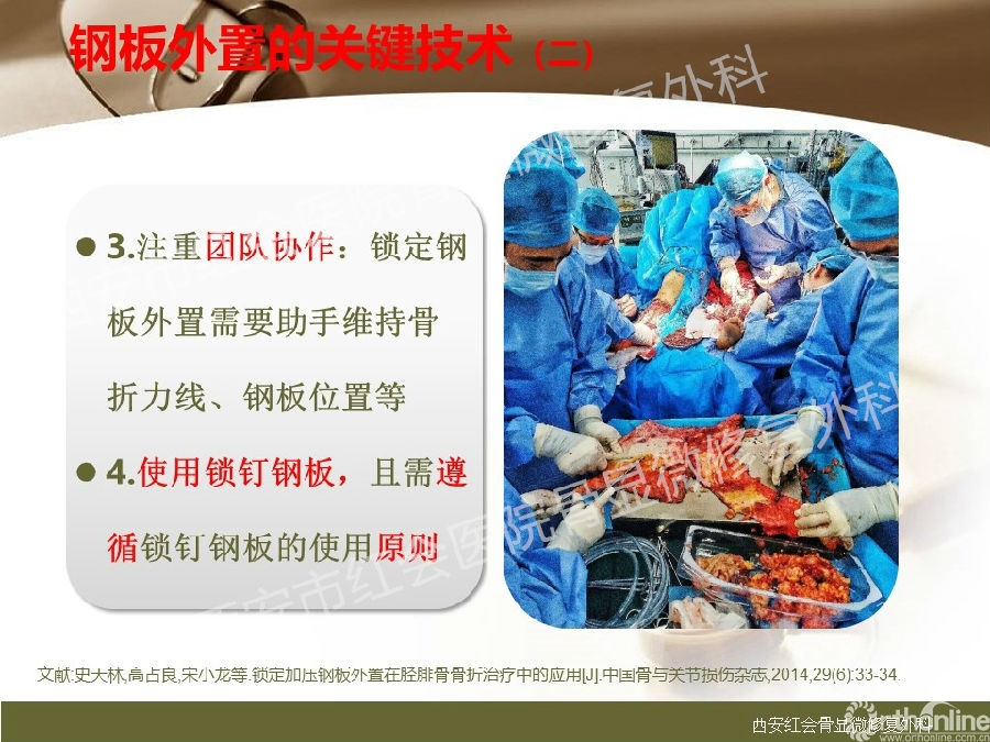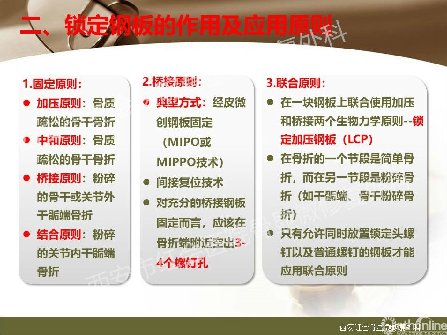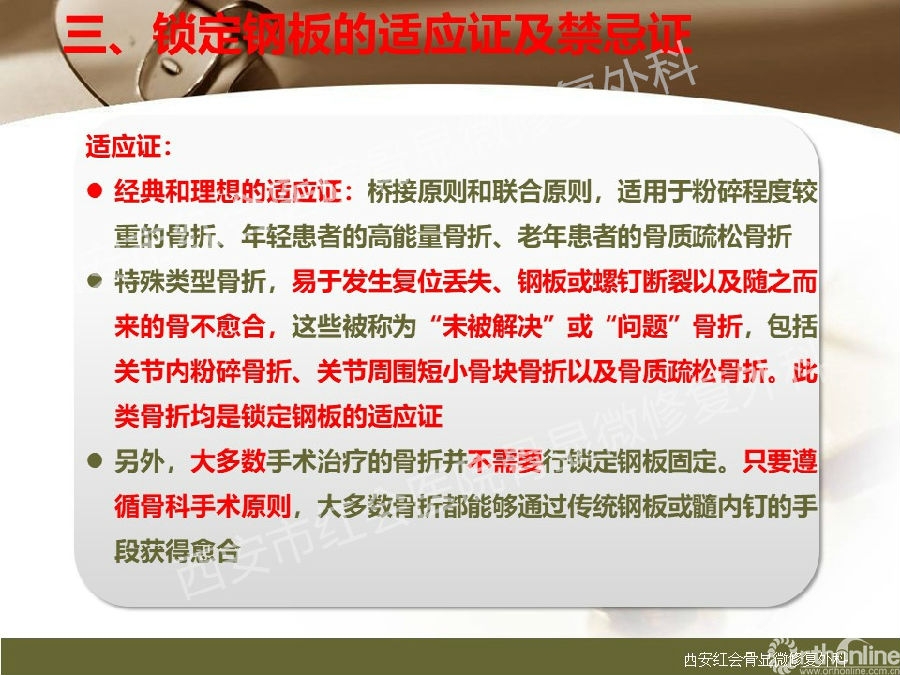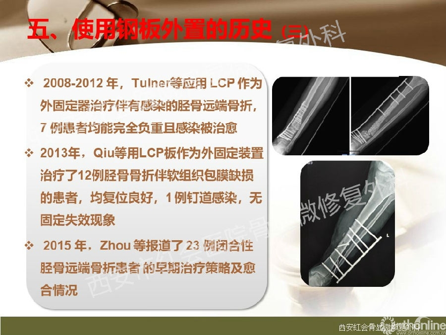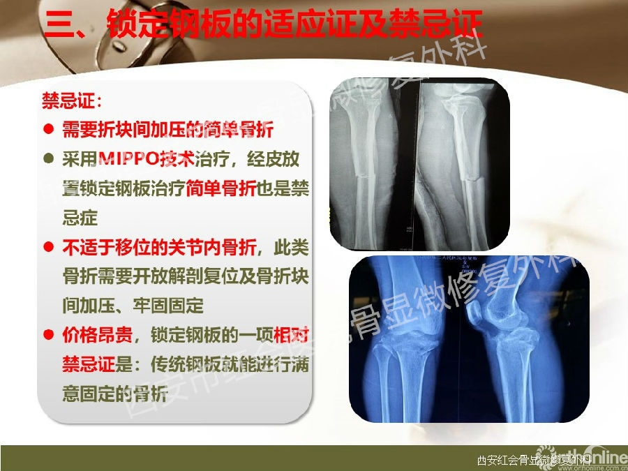 编者按:带螺纹孔的接骨板,与螺纹头的螺钉结合,共同构成角稳定的固定装置。不带螺纹孔的接骨板,通过钢板螺钉结构不同或垫圈进行挤压嵌入构成角稳定装置,称为锁定钢板。锁定接骨板技术是骨折治疗发展史上的重要里程碑之一。西安市红会医院骨显微修复外科张世辉医生从锁定钢板的作用、应用原则、适应证、禁忌证和优缺点等出发,分享了锁定钢板外置在下肢开放骨折中的应用,供广大同道参考学习。