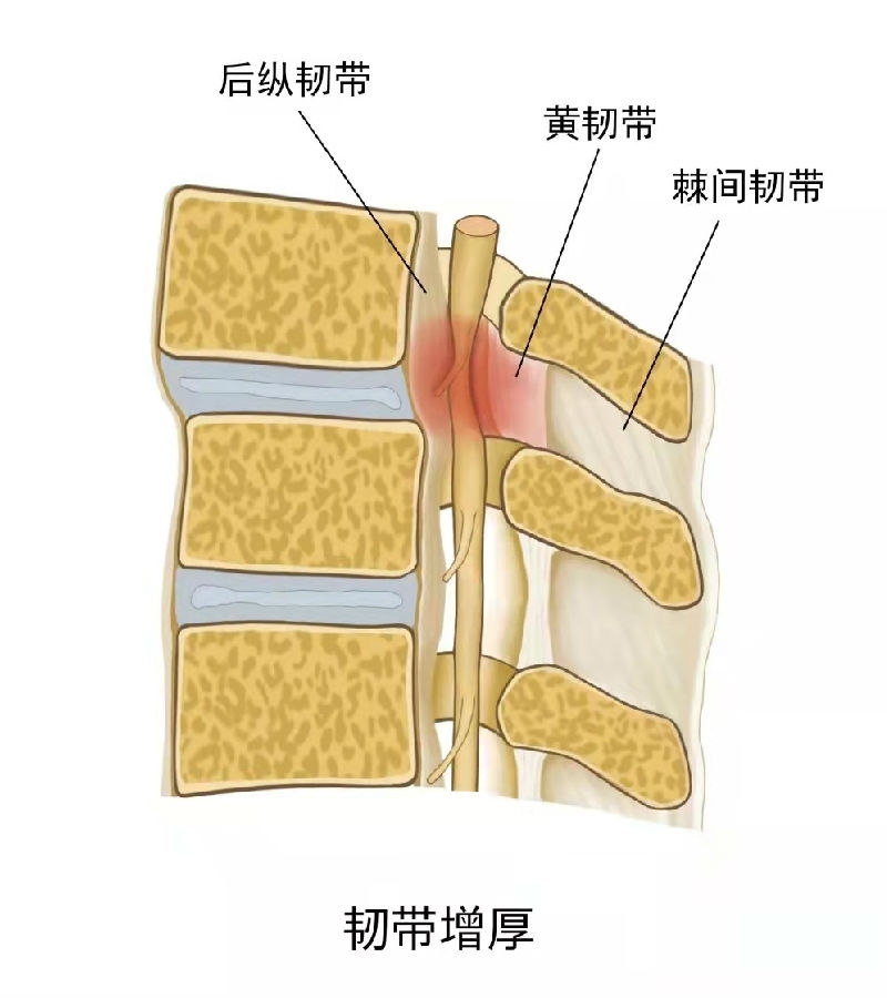 黄韧带肥厚或骨化是引起腰椎管狭窄的重要原因,当椎管已有狭窄或者伴有椎间盘突出时更会加重临床症状。黄韧带发生退变导致其纤维成分发生变化,弹性纤维的含量下降导致韧带弹性降低。当脊柱处于后伸状态时,黄韧带向后凸入椎管,压迫神经根,引起一系列临床症状。