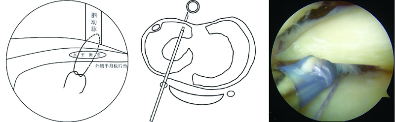 图1关节镜下 All-inside缝合外侧半月板后角及示意图显示缝合器存在穿透及捆扎腘动脉风险