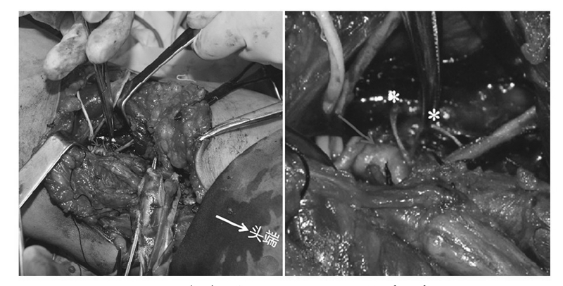 图6 术中照见 Omnispan(12°)系统(星号)将腘动脉捆扎(箭头)