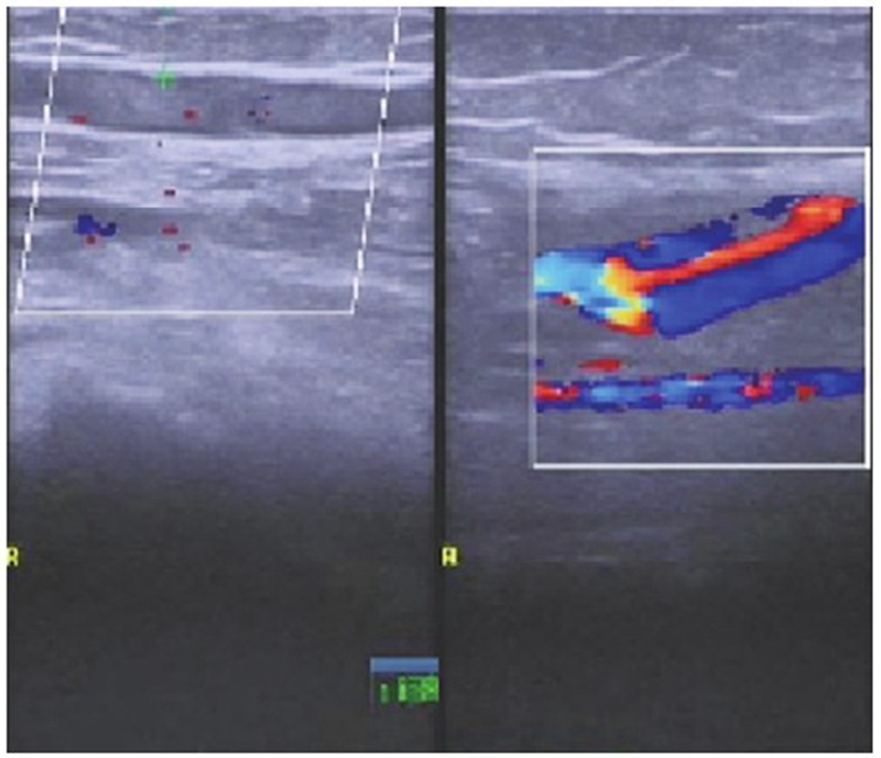 术后第1天复查下肢血管彩超及实验室检查凝血功能,发现腘动脉血栓形成及凝血功能异常(图4~5),患者未诉 不适。体检发现足背动脉搏动较对侧弱,皮温略低,末梢血氧饱和度90%。请显微外科及心血管内科会诊后,心血管内科建议切开取栓,将病情告知患者及家属后行急诊取栓术。术中可见腘动脉分叉近端约2cm大小的半月板缝合袢将腘动脉捆扎,但仍有血流通过(图6),切开血管,取出血栓,取出半月板缝合袢,松开止血带,见血流好,在显微镜下修复腘动脉,再次松开止血带,见动脉搏动良好,无漏血,足背动脉搏动好,末梢血氧饱和度99%,手术完毕。患者术后第1天开始主动活动,双侧皮温一致,未诉患肢疼痛,复查右下肢动静脉彩超示右侧动静脉血流通畅(图7),术后24个月随访患者右下肢活动功能良好,双下肢无明显肿胀,双侧皮温一致,小腿腿围基本一致,患者McMurray征阴性,前抽屉试验阴性,膝关节稳定性良好,活动度良好。