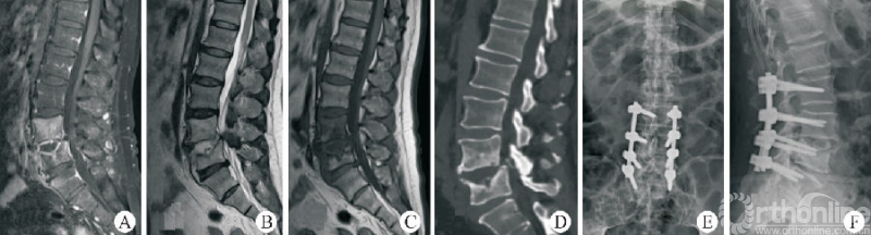 脊柱结核、化脓性脊柱炎等脊柱感染性疾病是脊柱外科的常见疾病,经正规保守治疗无效之后常需要外科手段的介入。经典的前路技术虽然效果确切,但因其手术创伤大、技术难度高等特点而难以在临床广泛展开。通过侧前方入路对脊柱感染部位进行彻底清创,以自体髂骨行植骨融合,联合后路钉棒系统内固定也是有效的治疗腰椎结核的手段(图3)[23-24]。